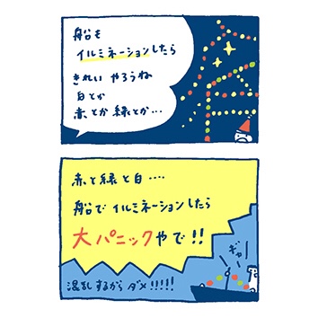 とかなんとかブツブツ言いながらも、澄んだ冬の空に暖かな光が灯るのはなかなか綺麗なもんです。だったら船もイルミネーションしたら、夜の海が華やかだろうなぁ、と思ったのです。素人のぼんやりした発想で。
