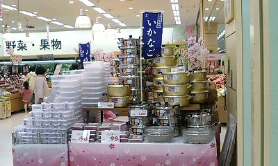 スーパーではザラメ糖に山椒に醤油など、イカナゴ釘煮の材料コーナーもできてます。ザラメ使うんですねぇ。ホームセンターにもタッパーに鍋ざる並びます。