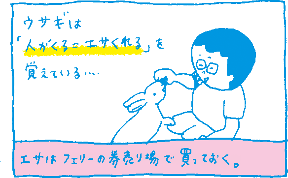 Get a rabbit food in ferry ticket office. 鹿と一緒で、人間の食べるもんはあげんほうが良い。