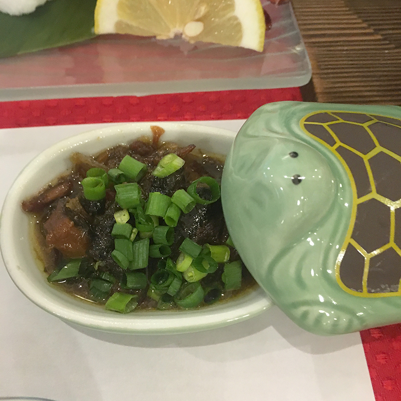 カメよ、なんとなくやけど君の内臓までちゃんと食べたい。(普段は臓物超苦手で食べないけど)内臓の煮込みも食べてみる。美味しいやん!