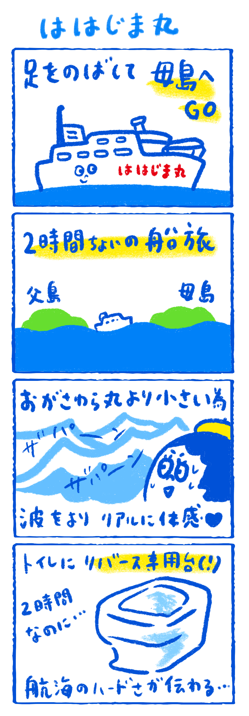 交通機関はもちろん船。ははじま丸ちゃんでどんぶらこ。