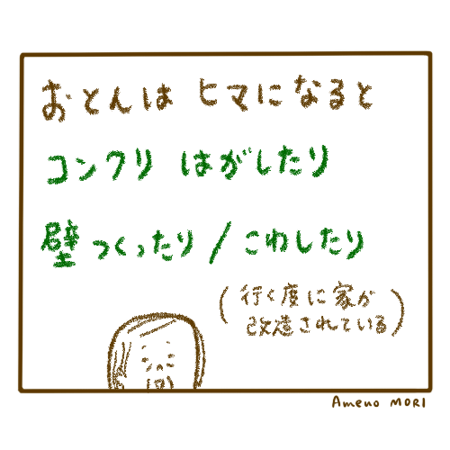 そしてゲンさんのお父さんは、ヒマになると、先代がやったコンクリートをひっぺがしたり(家庭菜園をするから)、壁をとったりフローリングの板張りをしたりするのが趣味で、家に行くたびに色々改造されている(!)