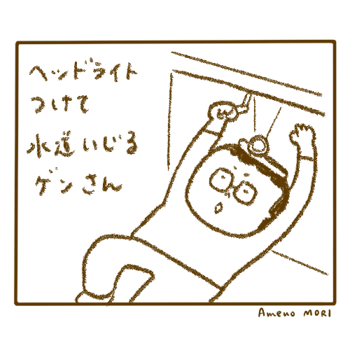 またしてもAmazonで水道部品を調達し、慣れた手つきで作業をするゲンさん。ヘッドライトがプロっぽさをアップさせます。