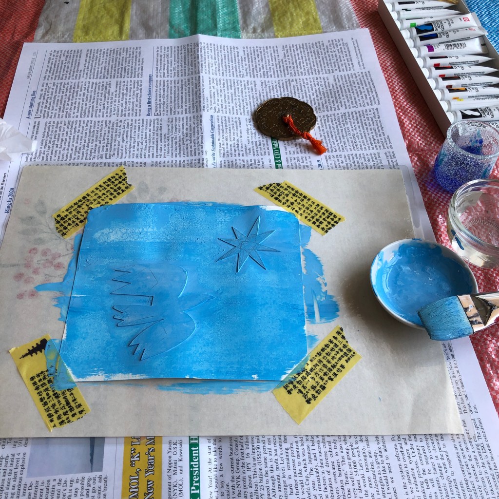 乾かないうちに紙を上から載せて、バレンがないので文鎮でゴシゴシ