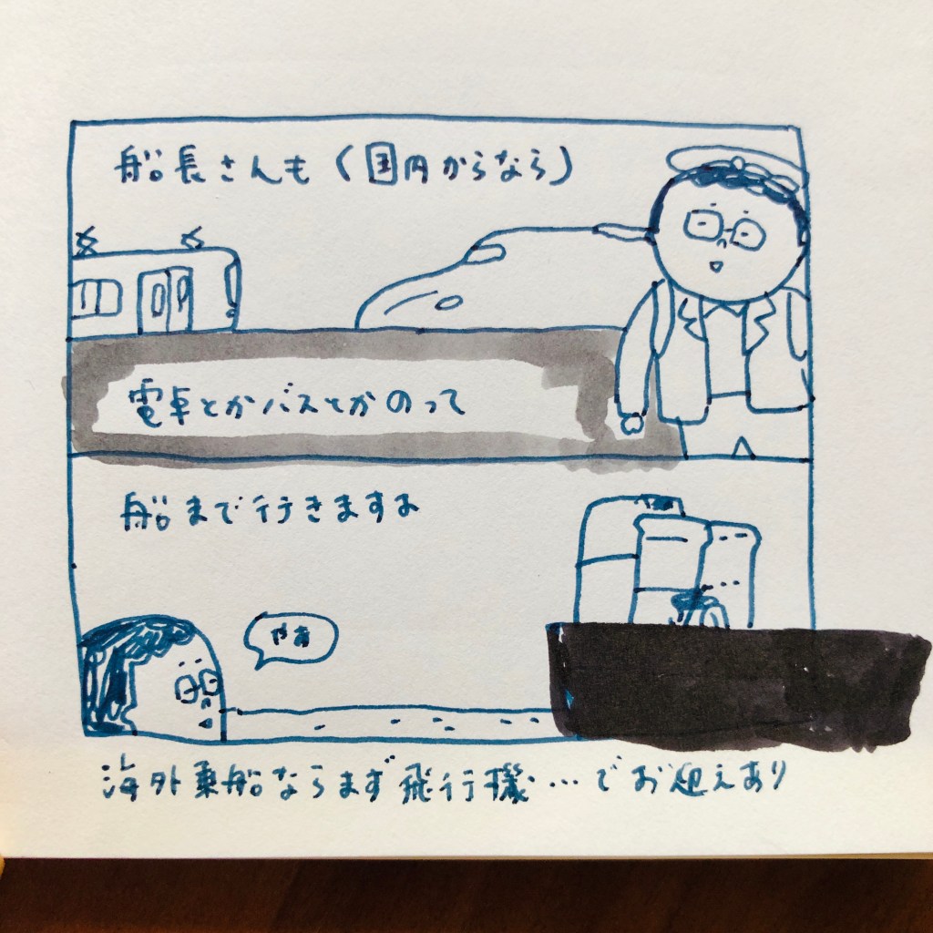 国内から乗るときは、普通に出張するごとく、電車とかで港まで行く船長。