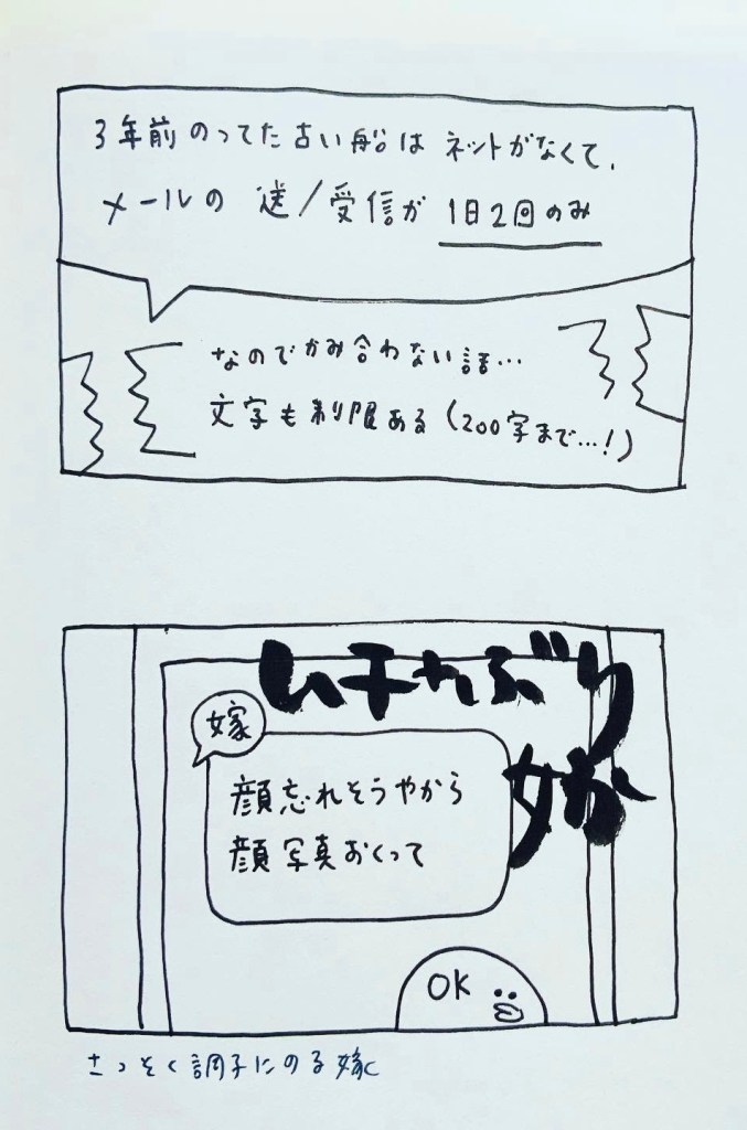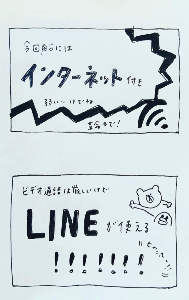 ゲンさんが今回乗った船はインターネット付き。電波は強くないけどLINEのやり取りならいけるいける。最高。