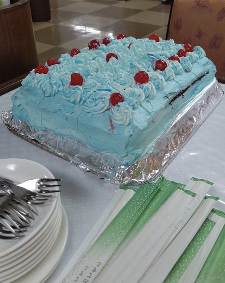 船めし。青いケーキ…見た目に反して、とても美味しかったとのこと(ゲンさんが美味しいと褒めるのは珍しい!)。この色よ。