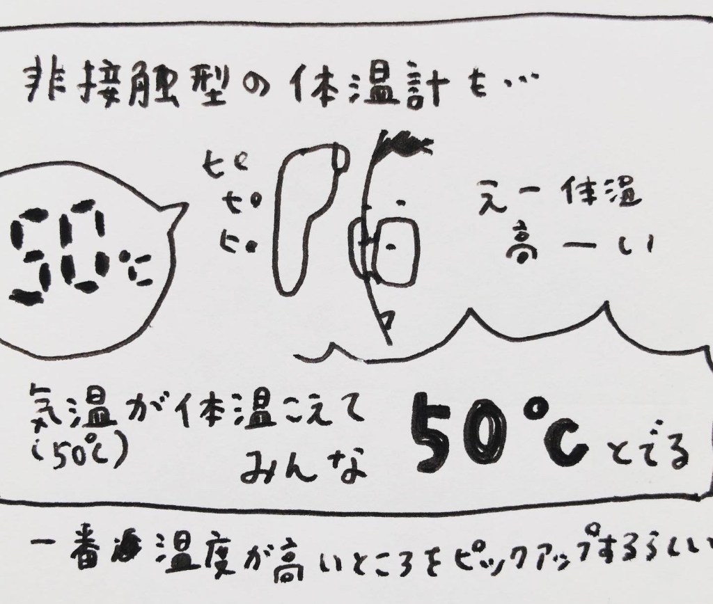 体温計までおかしくなるとのご報告。非接触型の体温計で、気温が体温を超えると…温度が高い方が測定値になる… ので