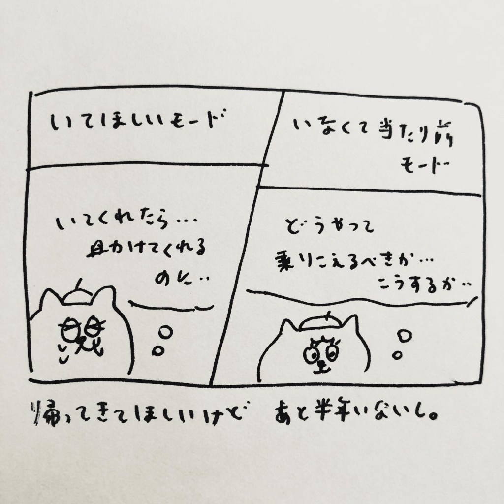 そうやってだんだん慣れていきます。一人に慣れすぎた頃に帰ってくるので、再びパニックになるというループ…