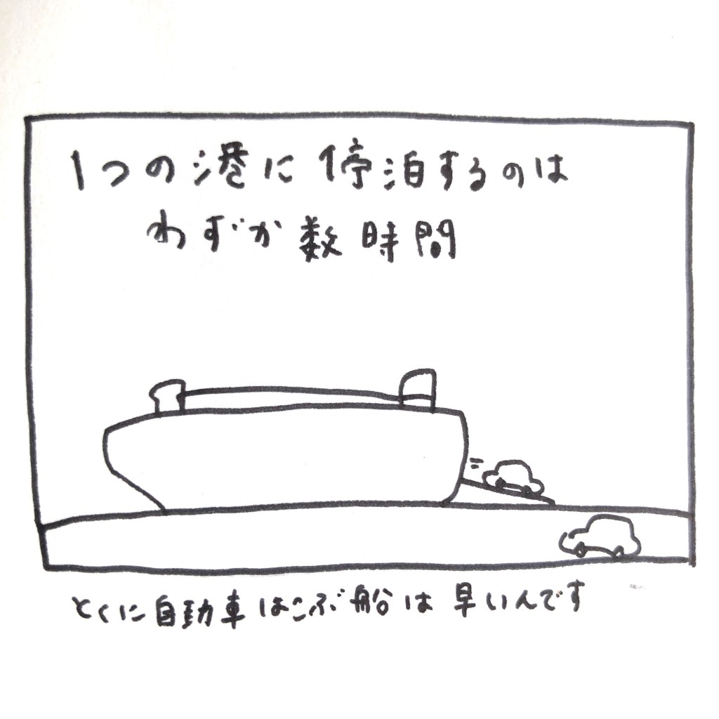自動車運搬船の荷物のあげおろしは数時間〜1日、停泊もすぐ終わっちゃう。これが石炭運搬船だと一週間停泊したりするのだけど…