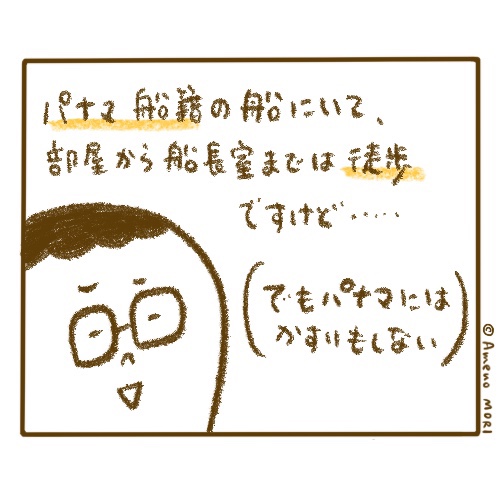 ゲンさんに調査内容を伝えたら、乗っている船がパナマ船籍なので、パナマに単身赴任してるとも言えんこともないけどって…パナマな船の上で徒歩移動してるけど…