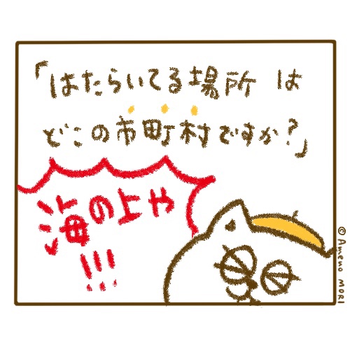 夫の勤務先の市町村・・・?えーーーーと、市町村どころか国すら不定、海の上や!!