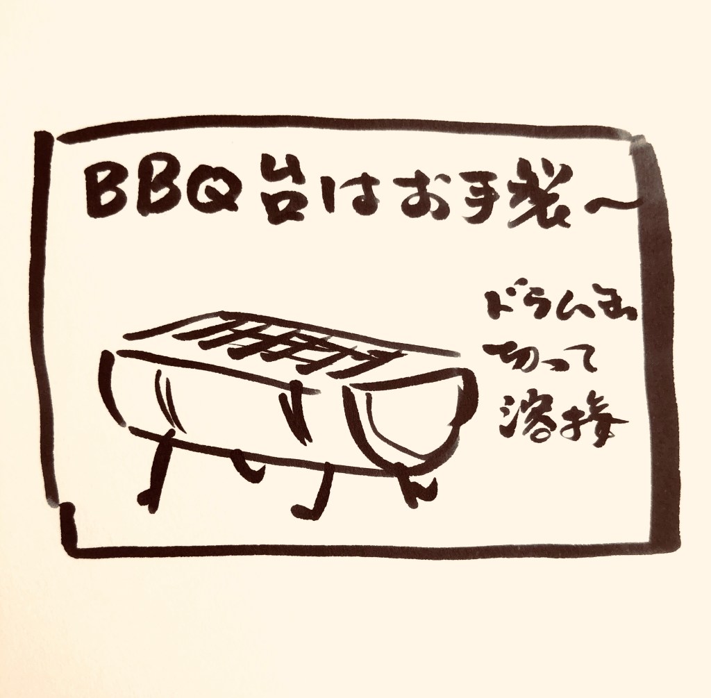 ドラム缶を切って溶接して作った、クルーお手製BBQグリル。ほんとにワイルドな人は台から作るんだね…
