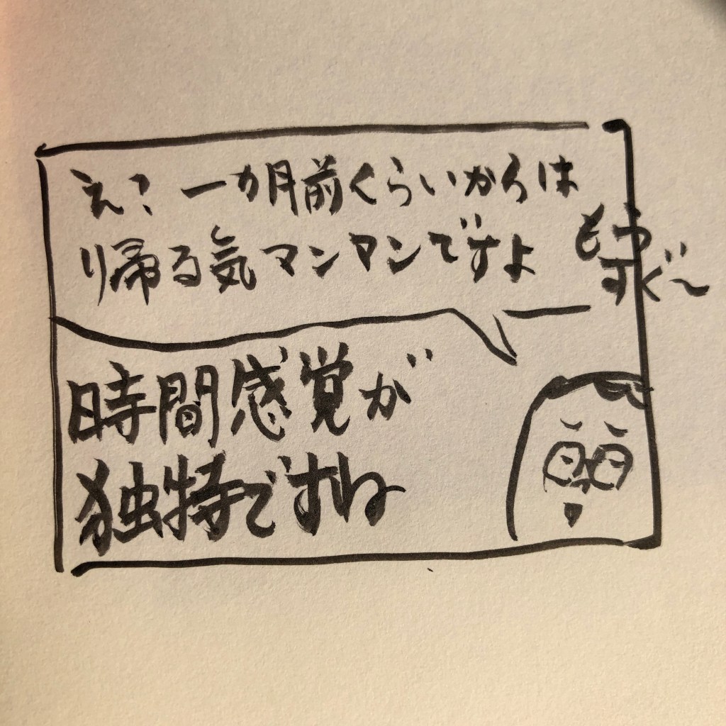 こっちもだんだんマヒしてきて、八ヶ月のうちの一ヶ月だから「あ、もうすぐね」とうっかり船乗りに毒されて影響受けまくっています。恐ろしい。