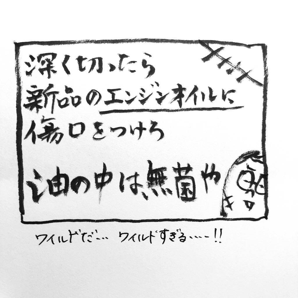 「深く切ったら、新品のエンジンオイルに傷口をつけろ、油の中は無菌だ」