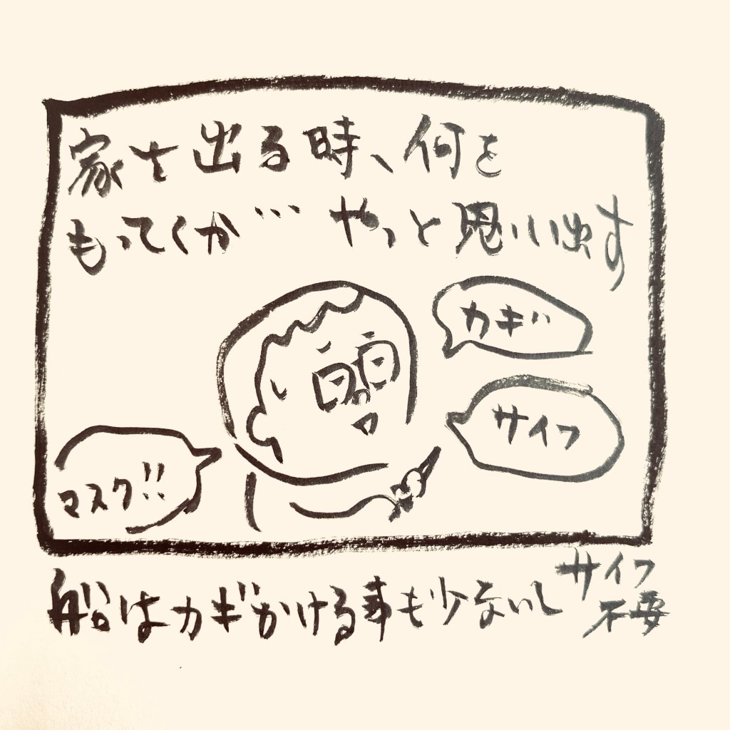 陸のお出かけには何を持ってくか、まだリハビリ中。船にいたらカバンがいらないもんね…