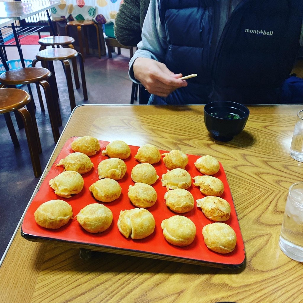生地はもっちり。でもあっさり。今まで食べた明石焼の中で、一番ソースが合う(明石焼き屋さんにはよくソースが置いてある)。