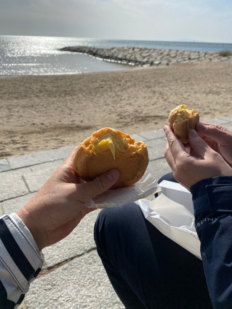 休暇中の船乗り家、今日のおやつは海岸でシュークリーム。