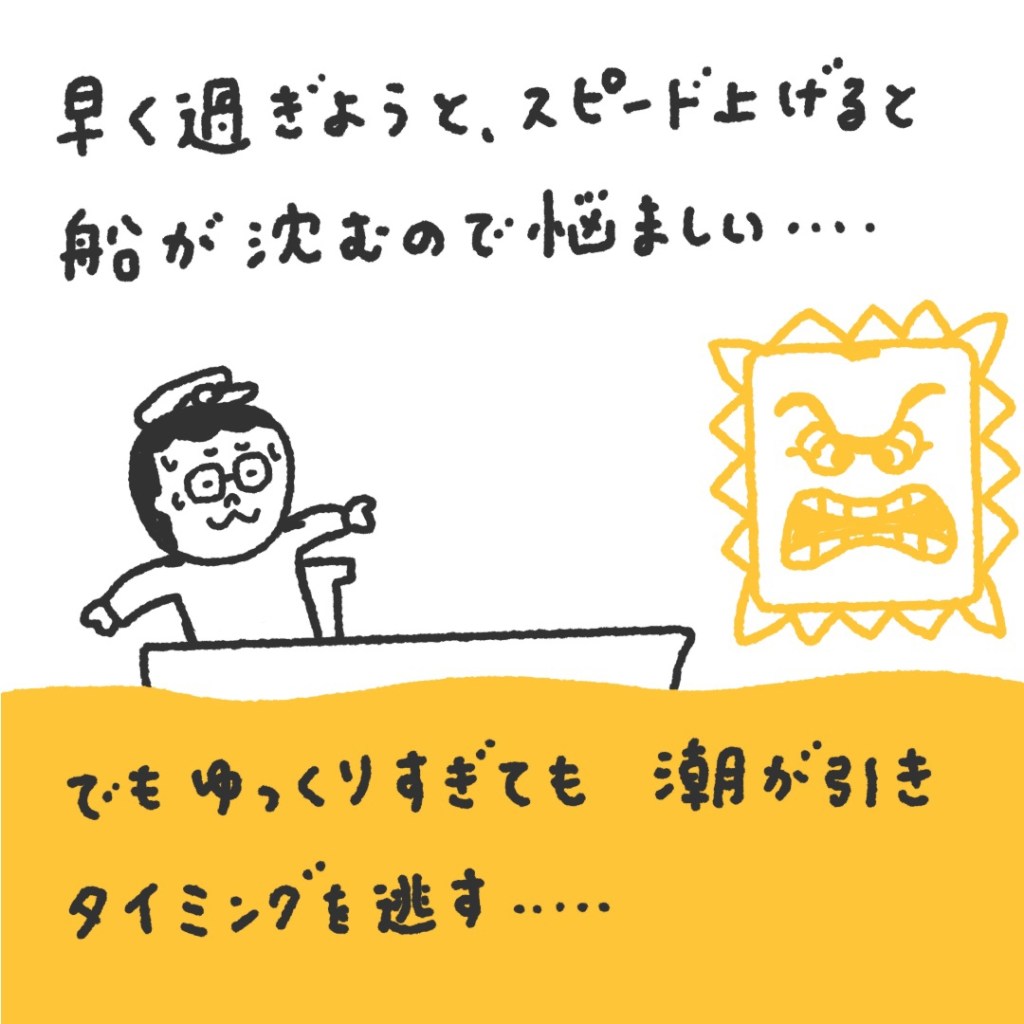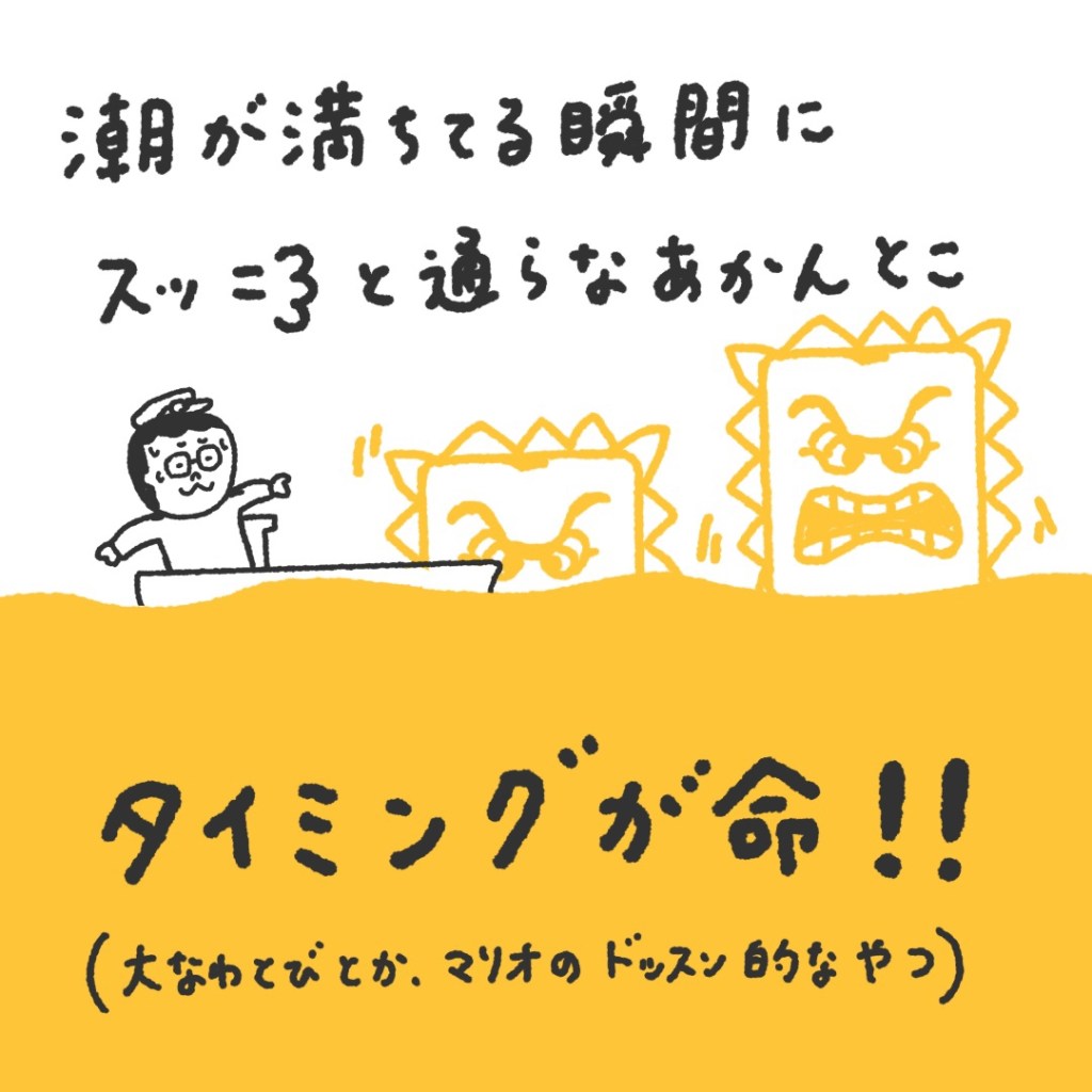 浅いところなので潮が満ちてる(=ちょっとでも水深が上がる)時に、スーッと通ること必須ですって奥さん。