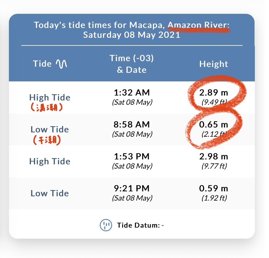 調べてびっくり。アマゾン川って満潮・干潮でだいぶ水位が違うんですねぇ。川でも、1日で2mくらい水位が変わるんだ!