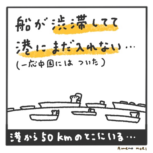 台風で港が三日間閉鎖されていた為、船が港に集中している・・・その距離なんと50kmですって(お盆の東名高速みたいである)