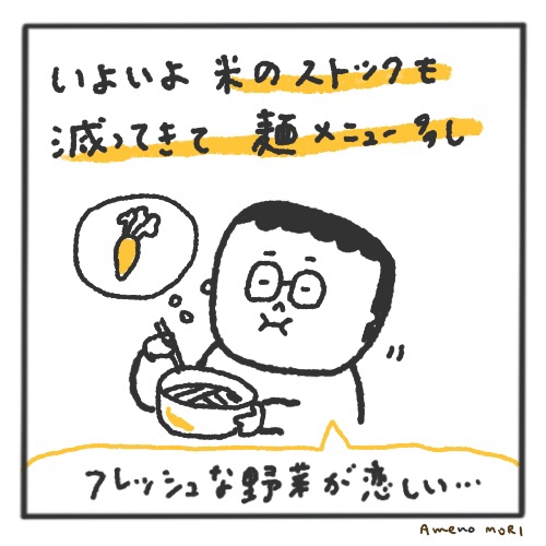 ただいま食料在庫がギリギリ、米も残りわずか。そこで乾麺メニューの登場というわけです。