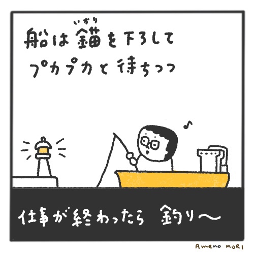 待つことに慣れすぎた船乗り達。錨をおろしたからレッツ釣り大会。
