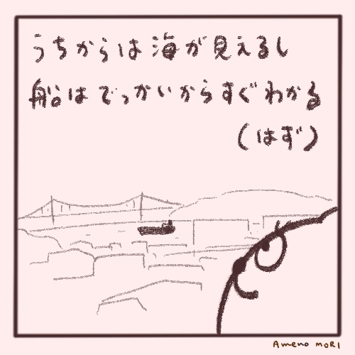 今のうちの家はですね、海沿いにあるのです。そんでちょうど、ゲンさんが乗る船が、うちの前を通過するという!