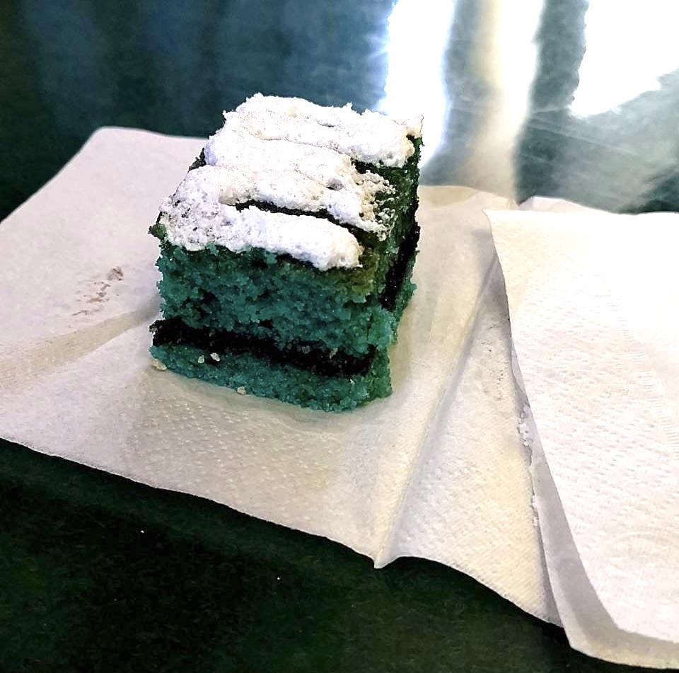 船のおやつのケーキ、こんなのが出たらしい。なんとも毒々しい!!(味は普通のケーキらしいけど)