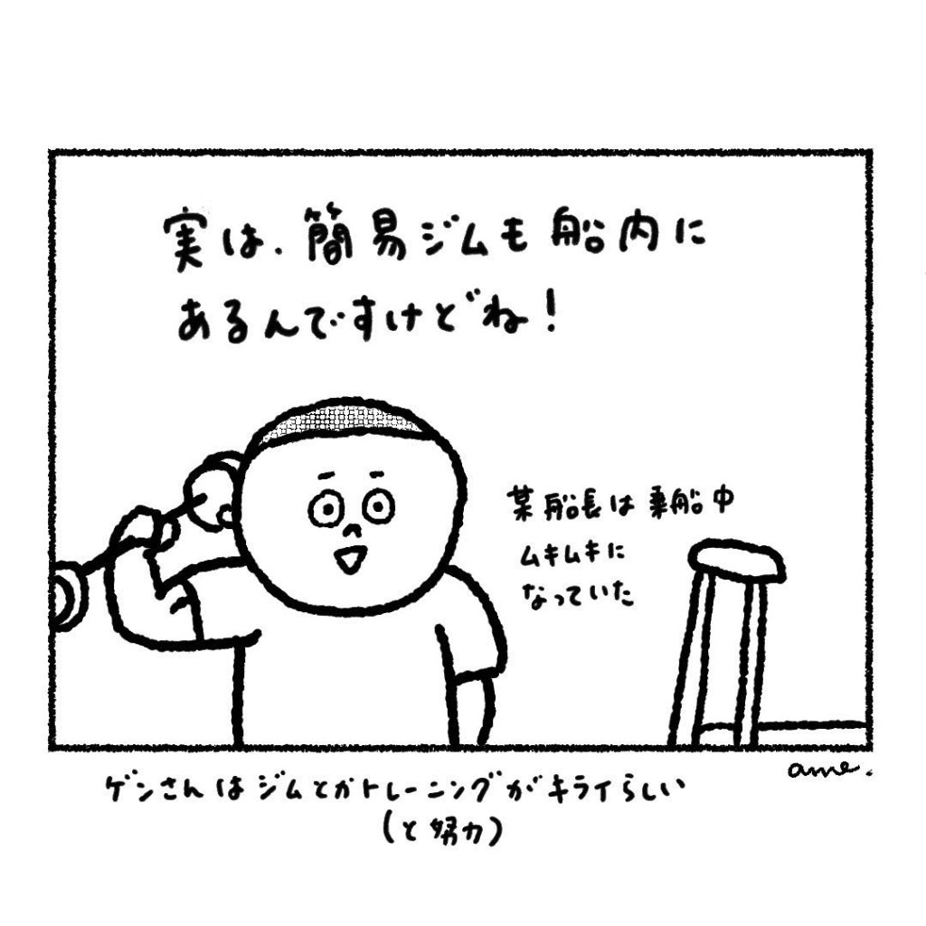 某船長が乗船中にジムにハマり、降りてきたらムキムキになっていたのを目撃しましたよ。うん。