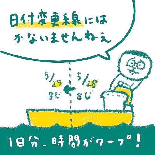 日付変更線を越えた瞬間、タイマーとか鳴るかと思いきや、船のナビの表示が、「西経」から「東経」に変わるだけらしい。意外と地味…