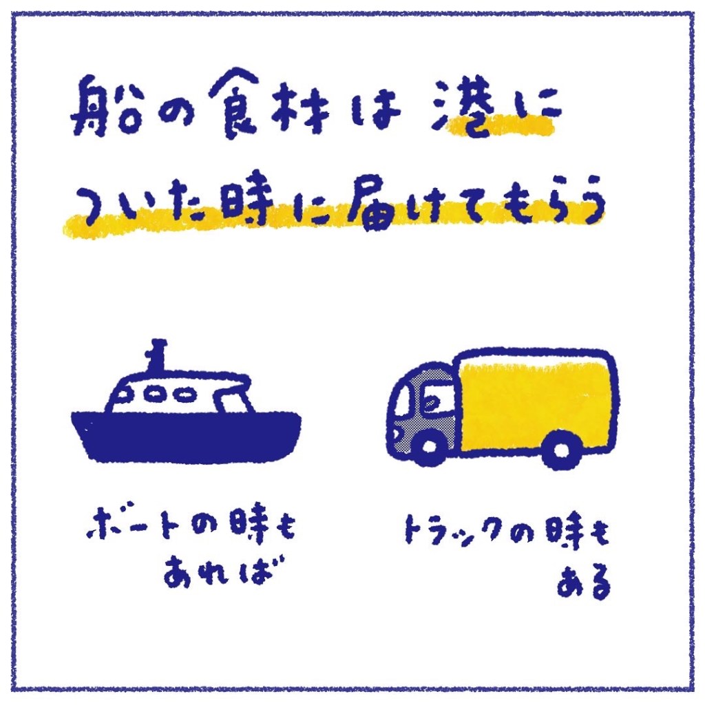 「船食(せんしょく)」と言われる、船の食料業者さんが世界中にあるので、そこから買って、港まで持ってきてもらいます。