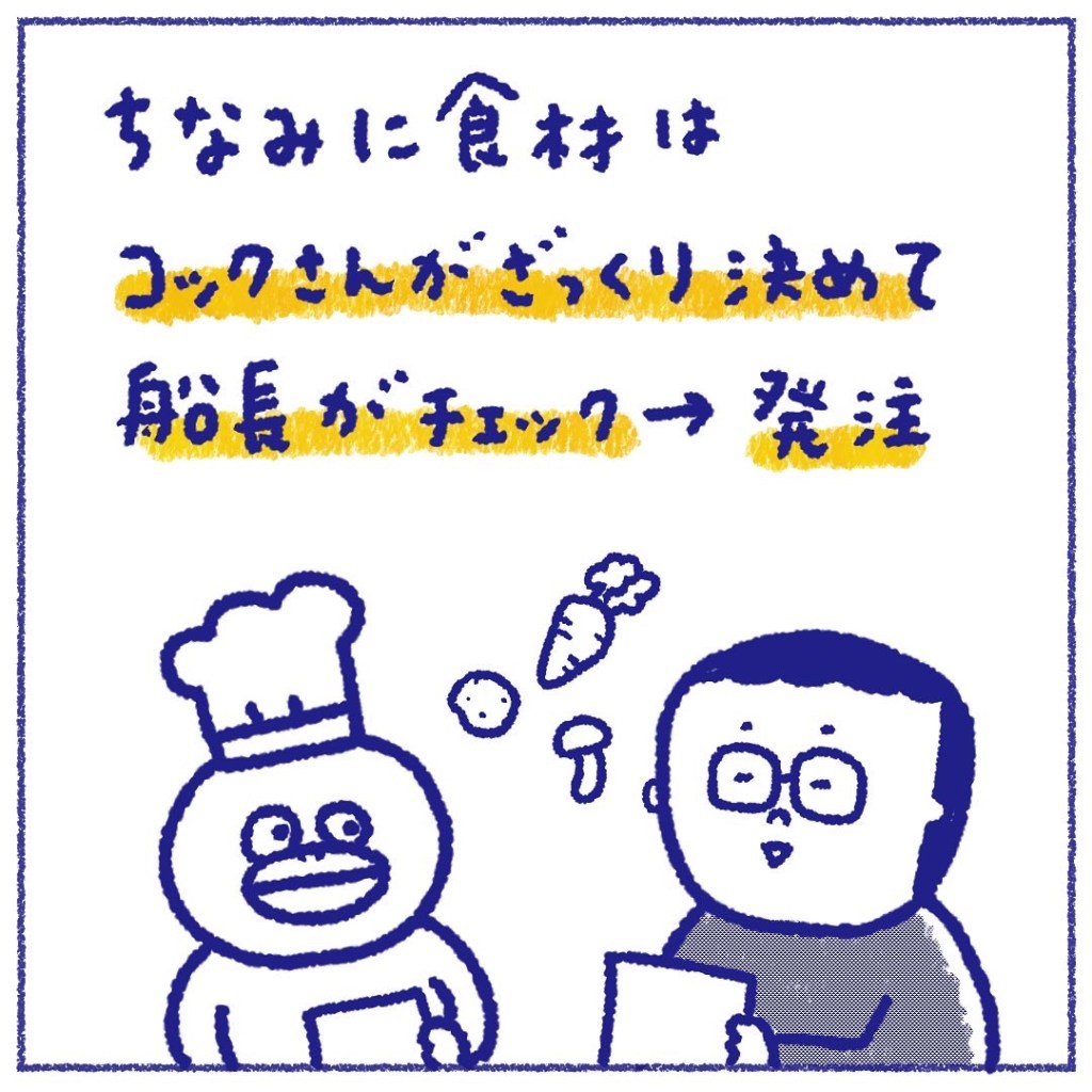 コックさんに期間と人数を元にオーダー表を書いてもらい、船長がチェックするとな。
