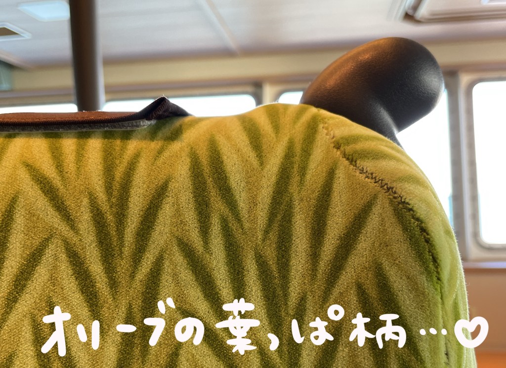 ▼先代のジャンボフェリーの座席はうどん柄でしたが、今回はオリーブ!経由する小豆島の名産なり。
