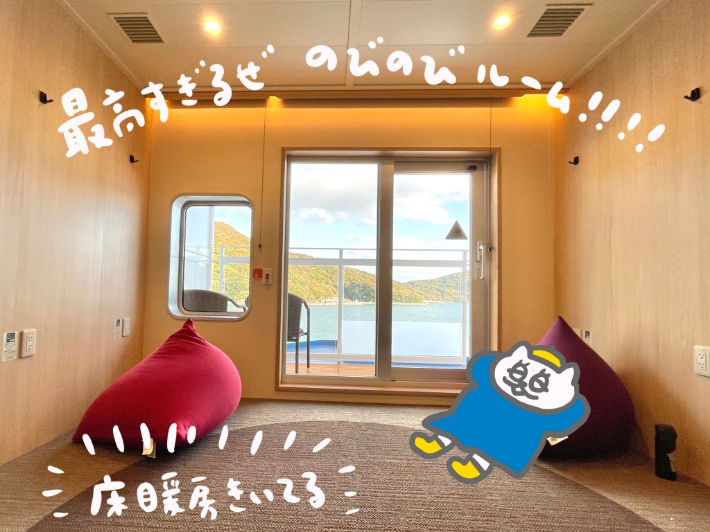 なんとヨギボーに床暖房付き。瀬戸内海の絶景つき。帰りたくない位、居心地よし。