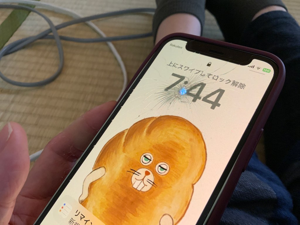 iPhoneはパジャマの裾につまづいて多分踏んで割れた⚡️発光してるがな。なんでやねん。