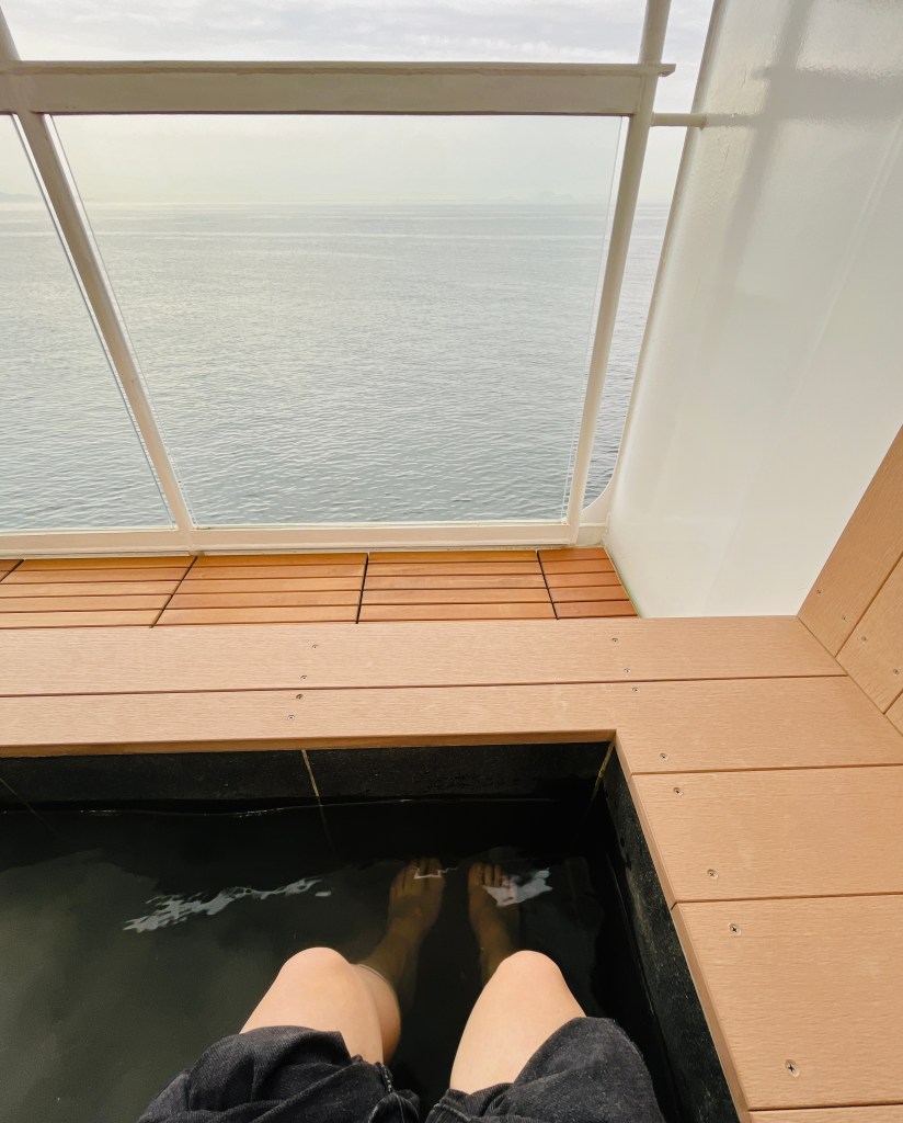 大きいお風呂と足湯もあるんですよ。海の上の健康ランドって言ってもいいかも…