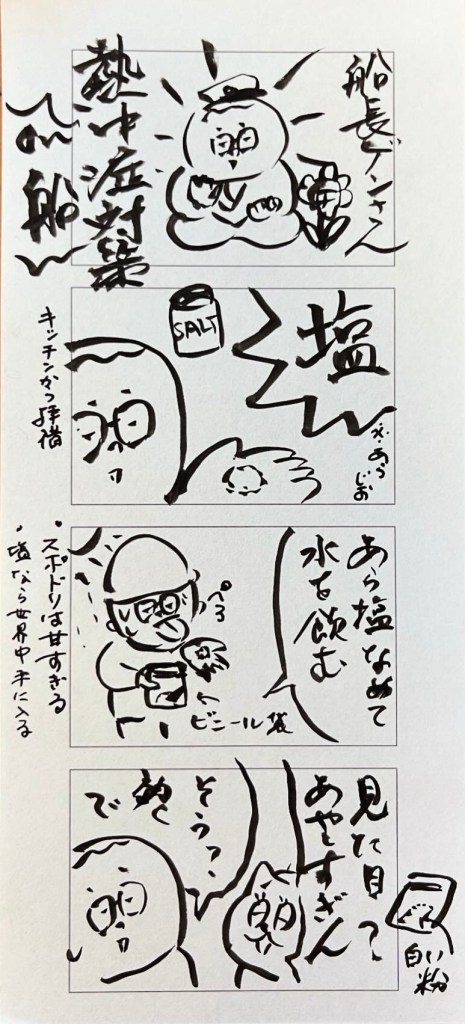 熱中症対策には粗塩と水だ、とすこぶるシンプルな意見の船長。