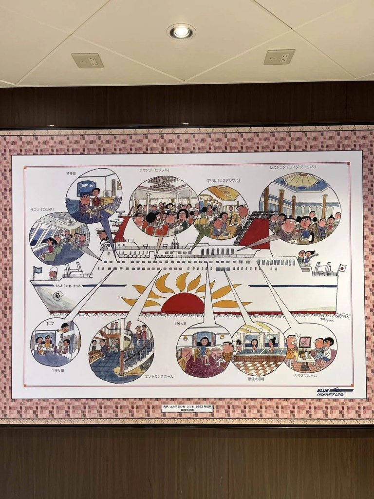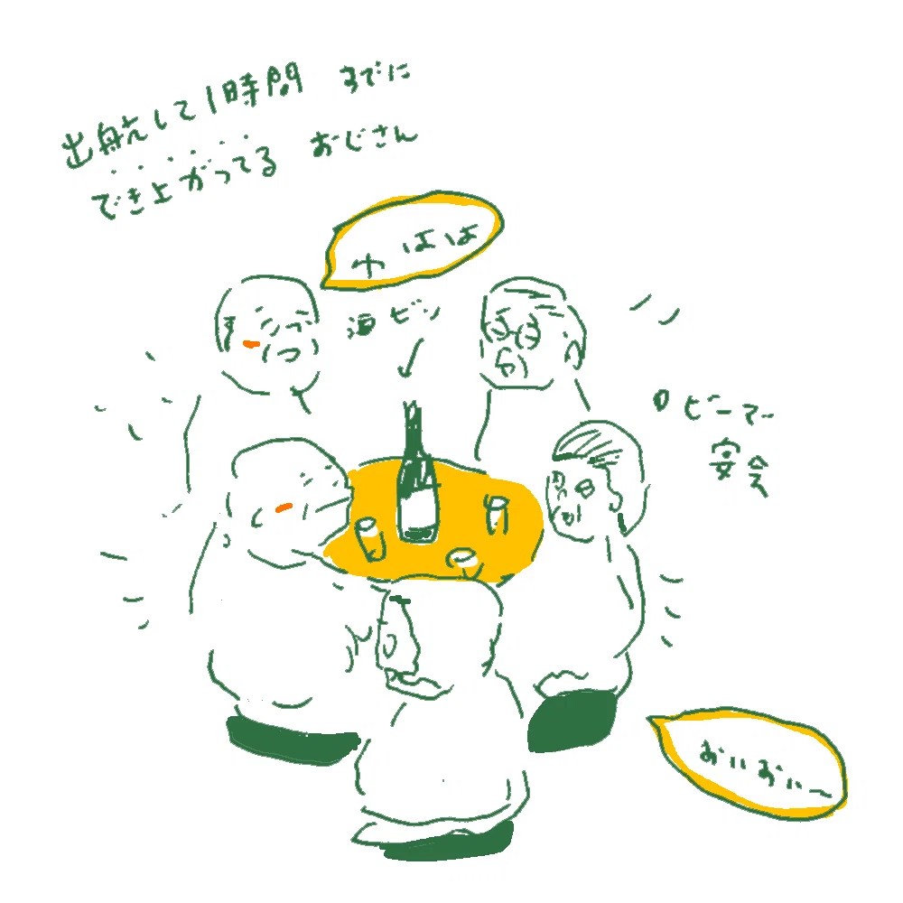 さてロビーを見渡すと、ほろ酔いのおじさん達が盛り上がっている。豪華や〜と言ってもフェリーの船内、なんかゆるい空気です。