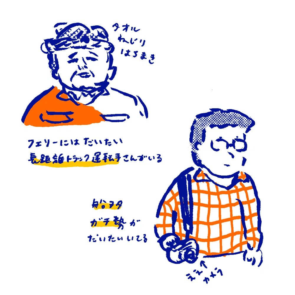 フェリーに乗ると、かなりの確率でトラック運転手さん遭遇します。そして…大型フェリーには船ヲタが高確率で出没する(我々もそうだ)。