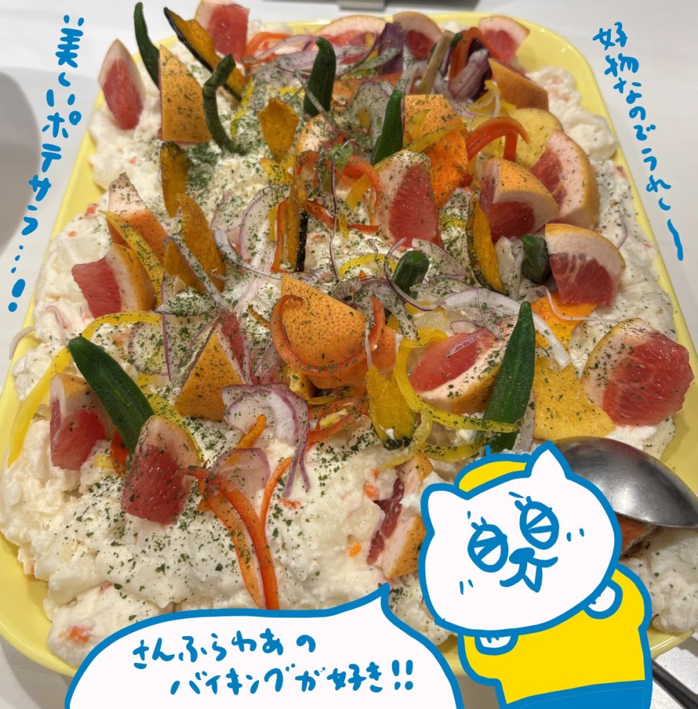 それこそ湯上がりで来る人もいるくらいカジュアルなのに、味は本格派なのよ…あたくしの大好きなポテサラがこんなに美しい姿になって…愛してるバイキング。