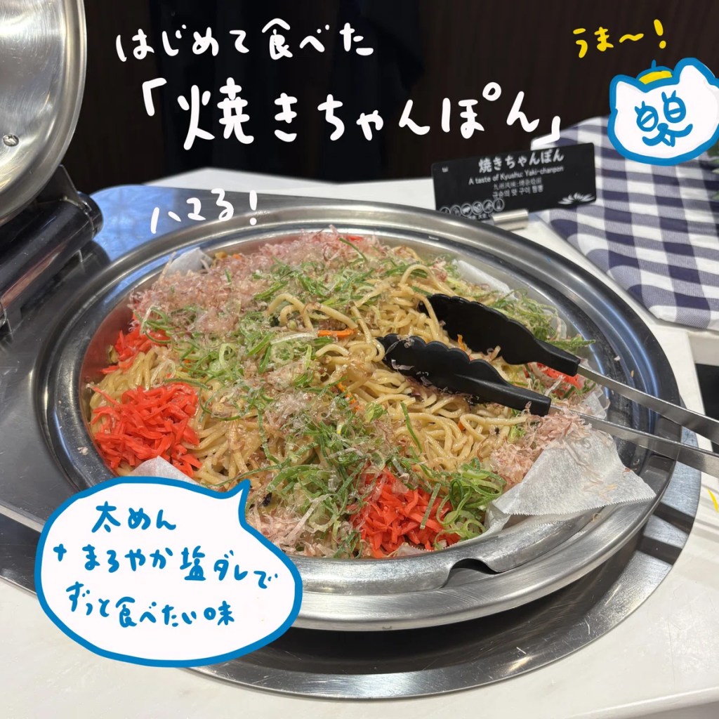 麺類は往路は焼きそば、復路は焼きちゃんぽんが出ていました。何これ初めてだけどすごく美味しい。