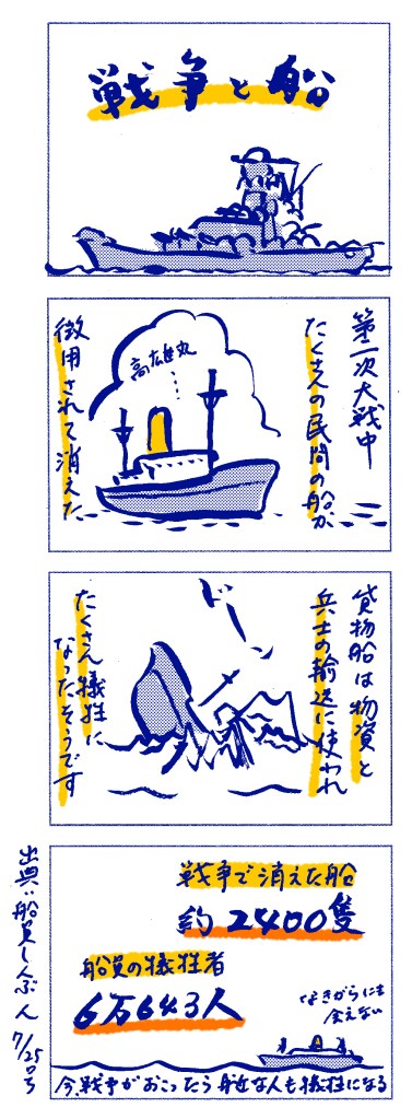 第二次世界大戦では、たくさんの民間船が空からの攻撃を受けて海に沈んだそうです。船は沈むと消えた人を探すことは非常に難しい。再会すら叶わないのは、とても悲しい。